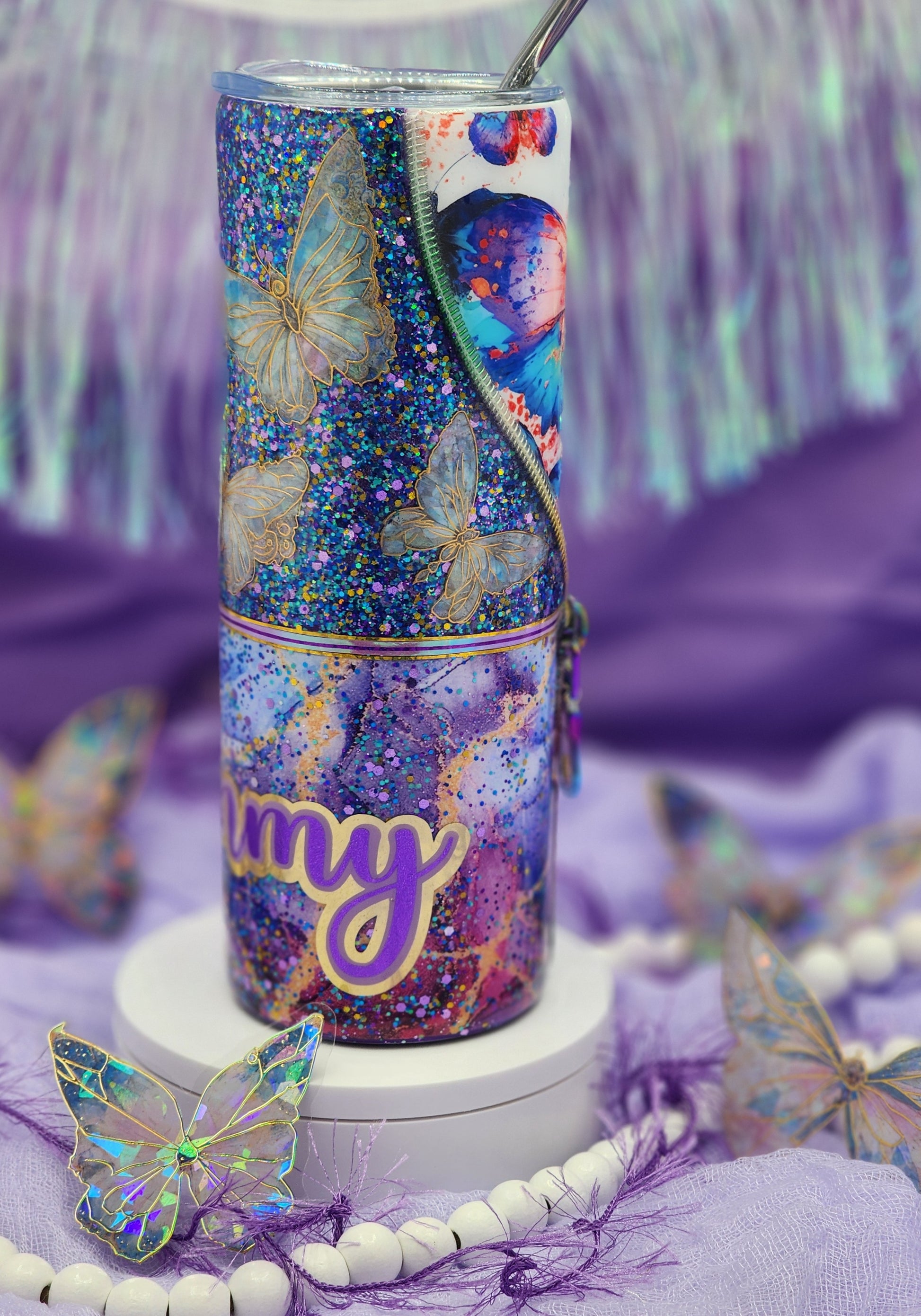 The tumbler's standout feature is its faux V-split zipper design, which creates a visually striking effect as if revealing a hidden world within. The "unzipped" sections reveal a beautiful array of butterflies in various purple hues, fluttering gracefully amidst a background of soft lavender and deep violet tones. This intricate design adds depth and sophistication, making it a true statement piece.