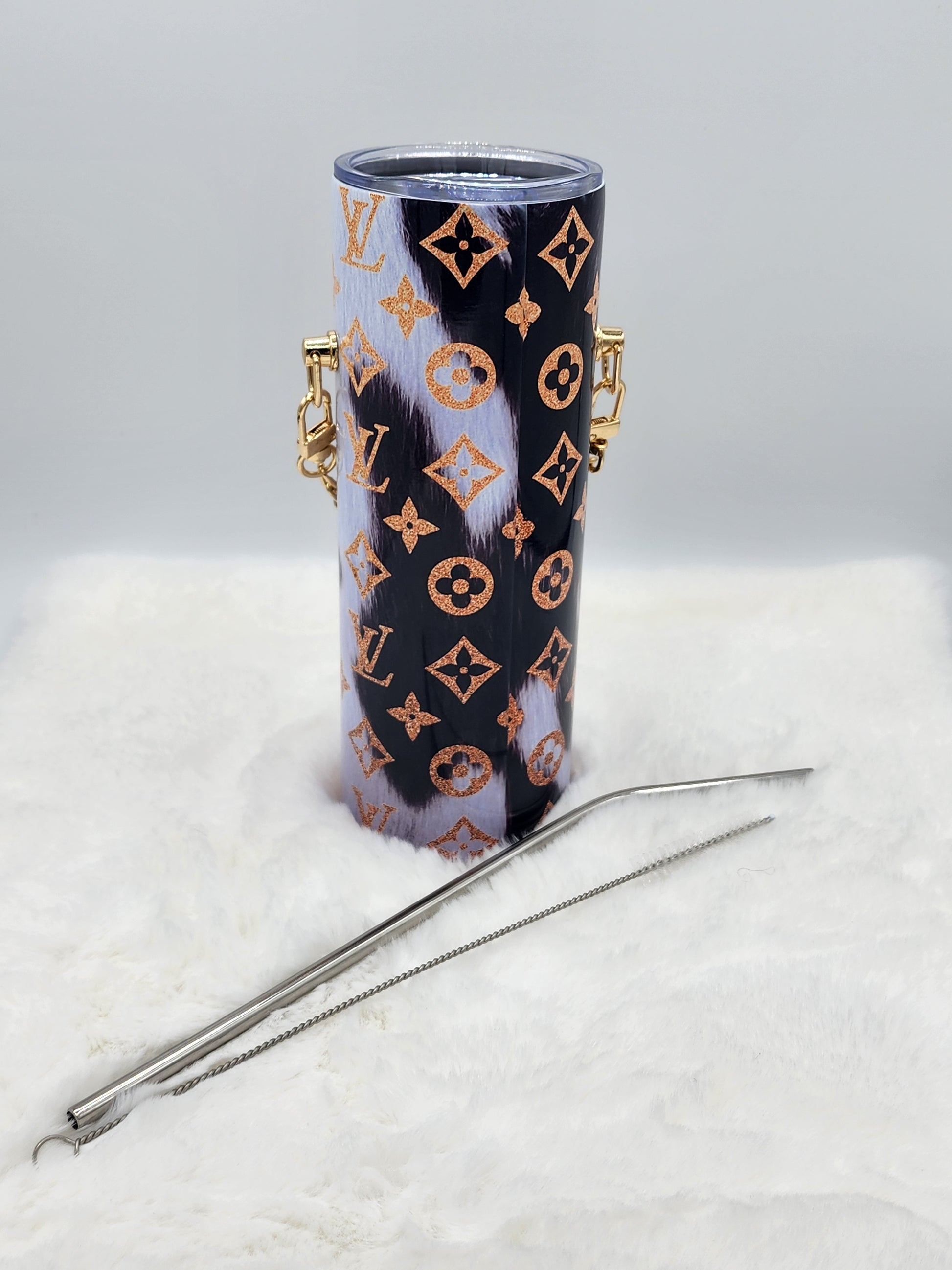Decorative Chain Strap adds a touch of elegance. While not functional for carrying, the stylish chain adds a fashionable flair, elevating the tumbler’s overall aesthetic. The chain’s luxurious design complements the cow fur pattern and Louis Vuitton monogram, making this tumbler a true statement piece.